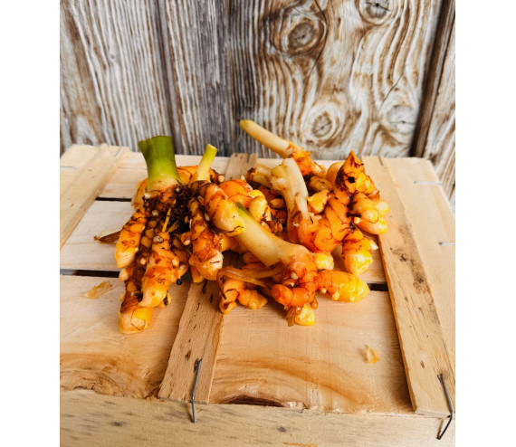 Kurkuma aus unserer Produktion. Er wurd im April im Gewäckshaus gesetzt und wir ernten ihn von Oktober bis Dezember.