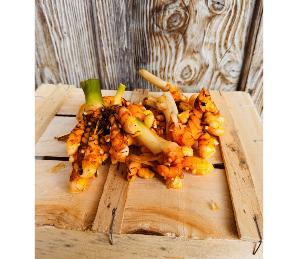 Curcuma frais de notre production. Planté en avril dans une serre, nous le récoltons d'octobre à décembre