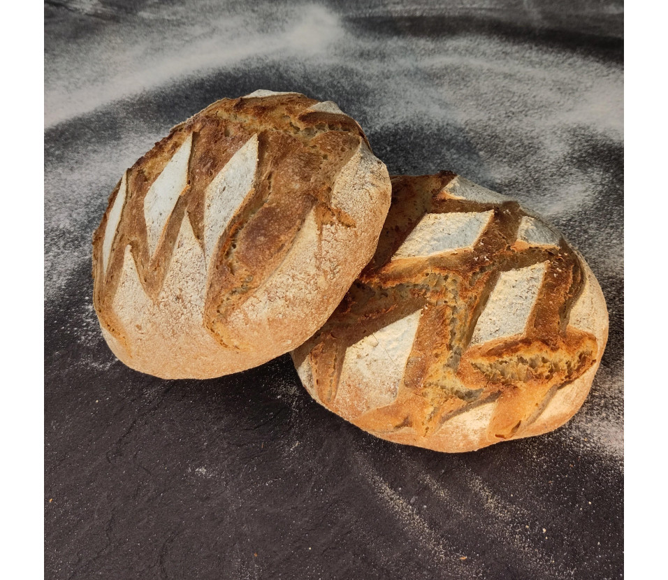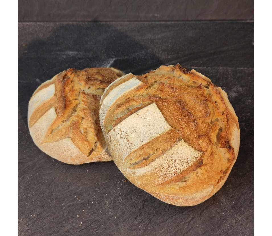Pain au levain naturel, confectionné avec de la farine de blés anciens, du sel de Guérande et de l'eau.